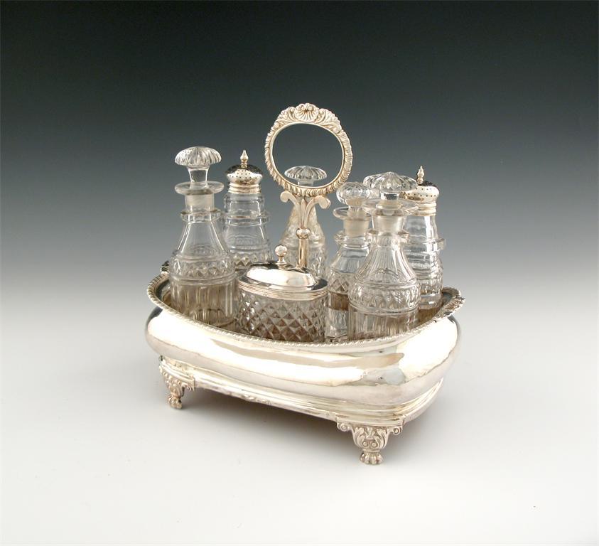 rounded rectangular form, gadroon and shell border, central shell capped carrying handle, on four bracket feet, with three silver mounted cruet bottles and four further cut-glass cruet bottles.