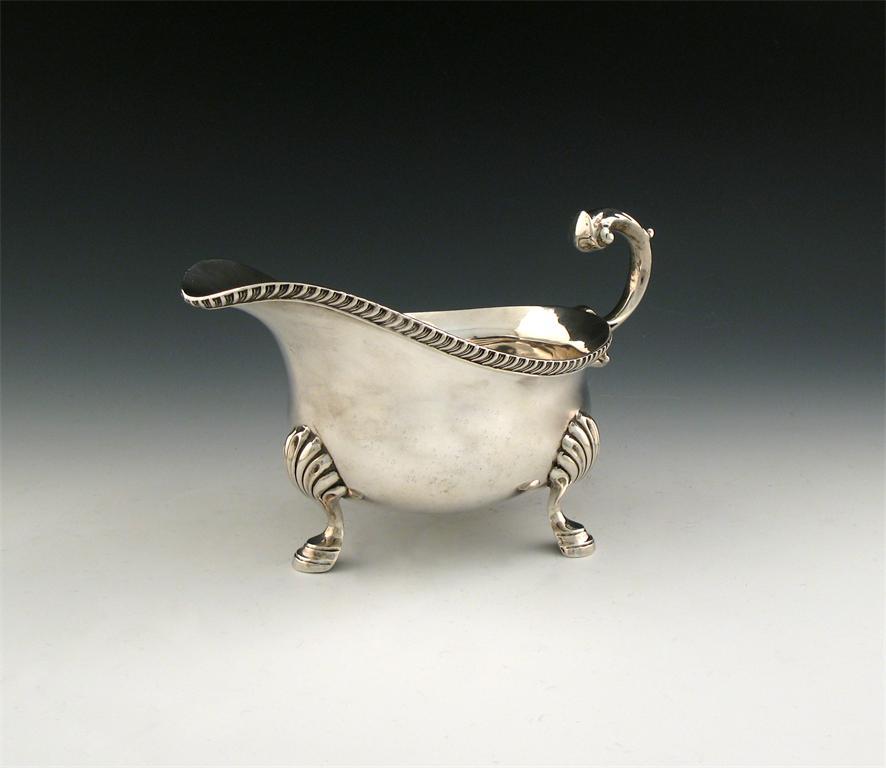 A silver sauce boat, by Page, Keen and Page, London 1930, oval form, leaf capped scroll handle, gadroon border, shell capped hoof feet, length 19.8cm, approx. weight 13oz.