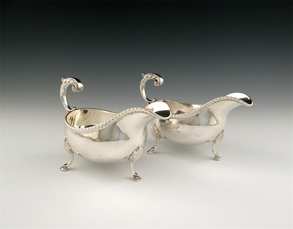 A pair of silver sauce boats, by Roberts and Belk, Sheffield 1976, oval form, leaf capped scroll handle, gadroon border, on three shell capped hoof feet, length 16.5cm, approx. weight 18oz. (2)