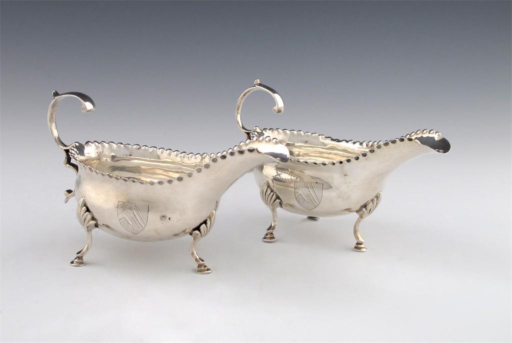 A pair of George III silver sauce boats, maker's mark worn, possibly WC, London 1776, oval form, scroll handles, punch bead borders, engraved with an armorial, on three shell capped hoof feet, length 15.2cm, approx. weight 7oz. (2)