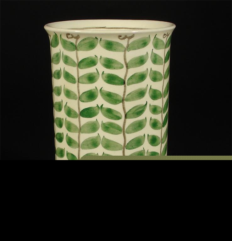 A Wedgwood earthenware vase by Louise Powell, cylindrical form painted with stems of leaves impressed mark, painted monogram, painted goblet mark 16cm. high