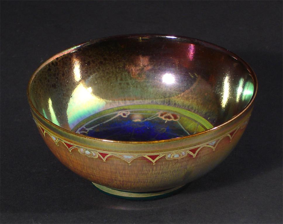 A Pilkington's Lancastrian bowl by Annie Burton, painted with simple flowerhead to well, in colours impressed factory mark, painted artist cypher 10.5cm. diam. Provenance The Bill Coles collection