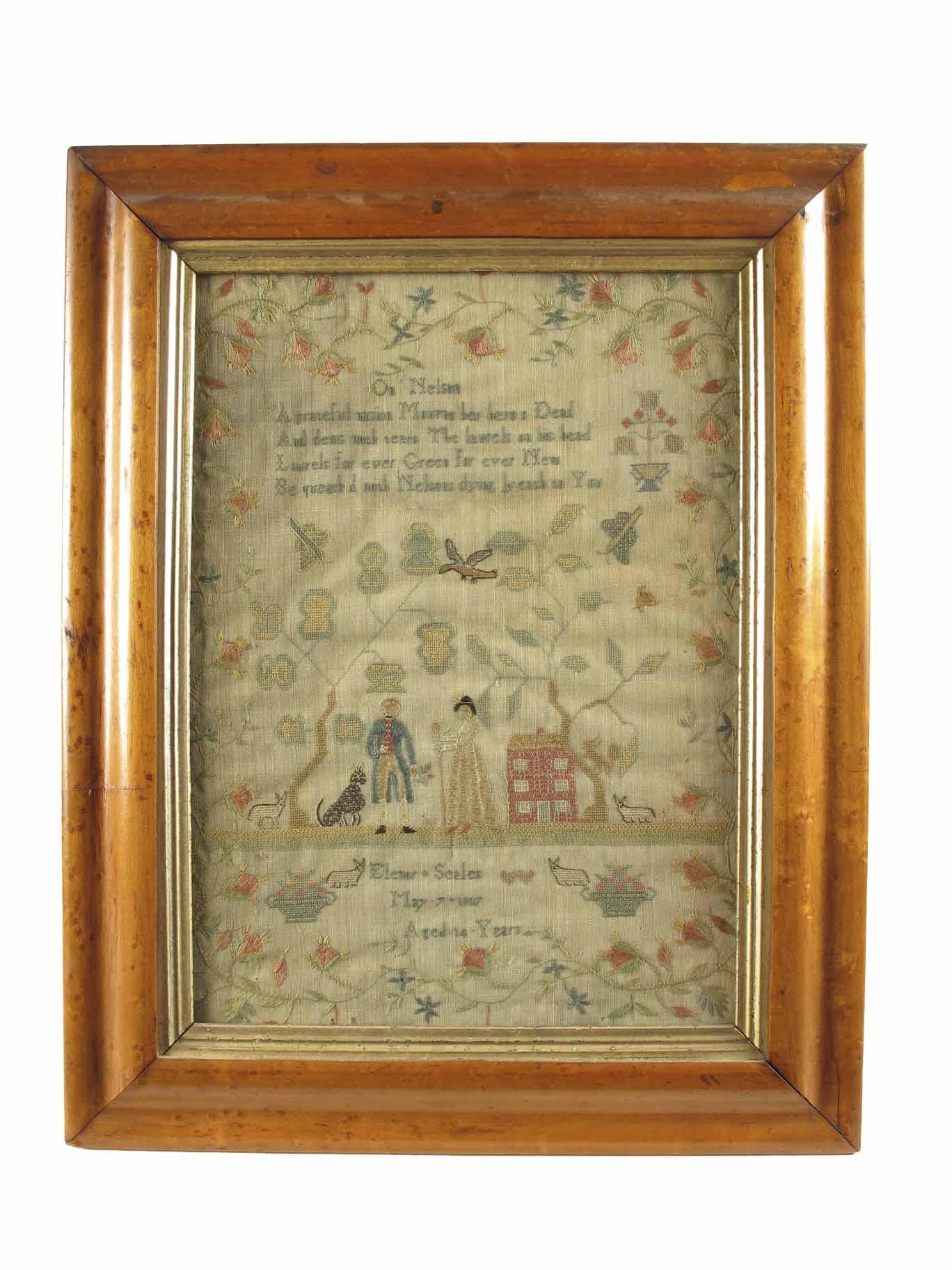 Nelson interest. A Regency sampler, Elenor Seales, May 7 1807, Aged 14 Years, worked a verse commemorating the death of Nelson, above a male figure holding a wreath and a shepherdess, with a three storey house, trees, animals and insects with a trailing foliage border, 14.5 x 10.5in (37 x 26.5cm).