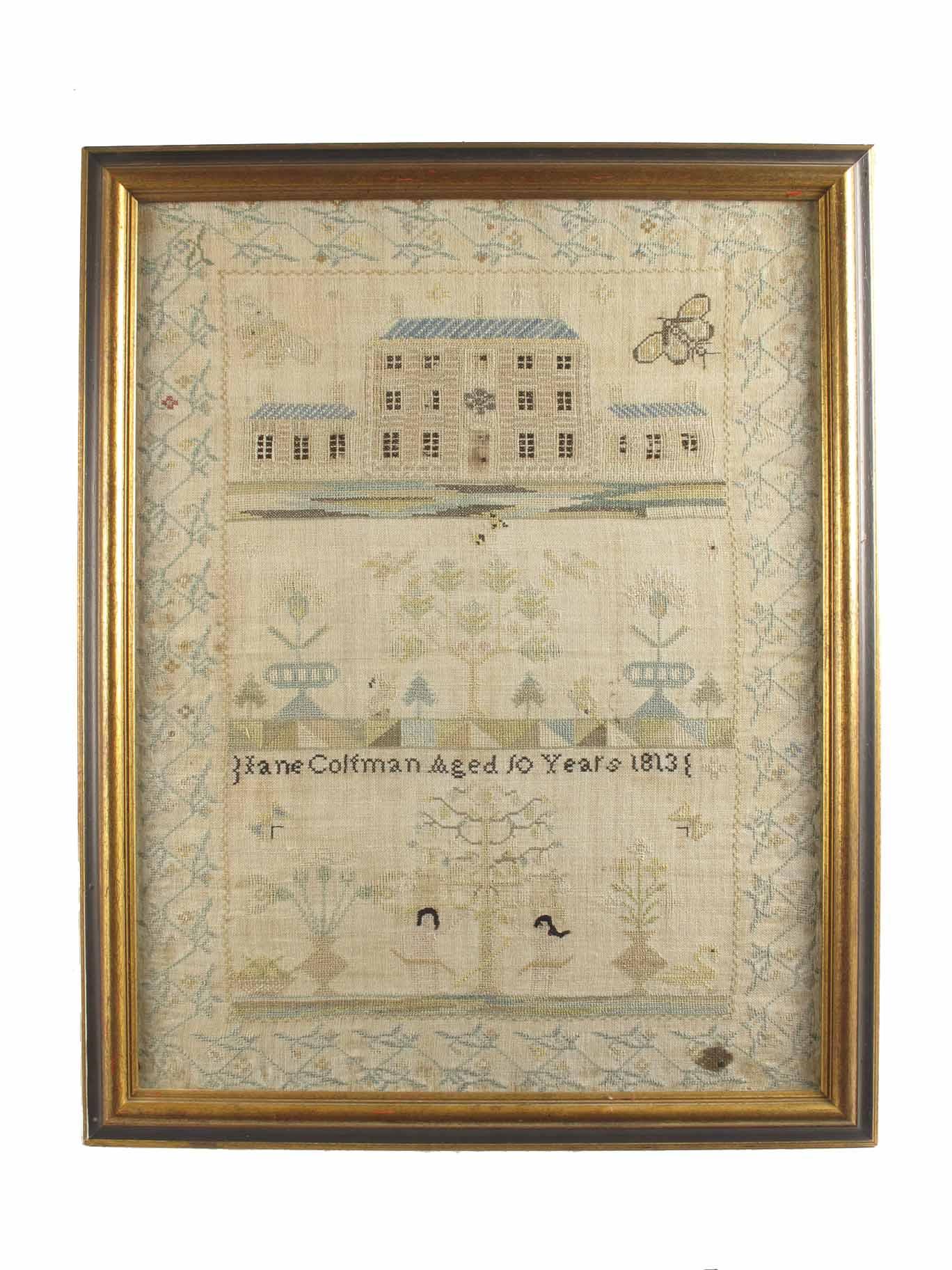 A Regency sampler, Jane Coltman, Aged 10 Years, 1813, worked a three storey house with winged insects, below with plants and birds, the base with Adam and Eve, further plants, insects and a swan, within a stitched border surrounded by a foliage outer border, 22 x 17in (56 x 43cm).