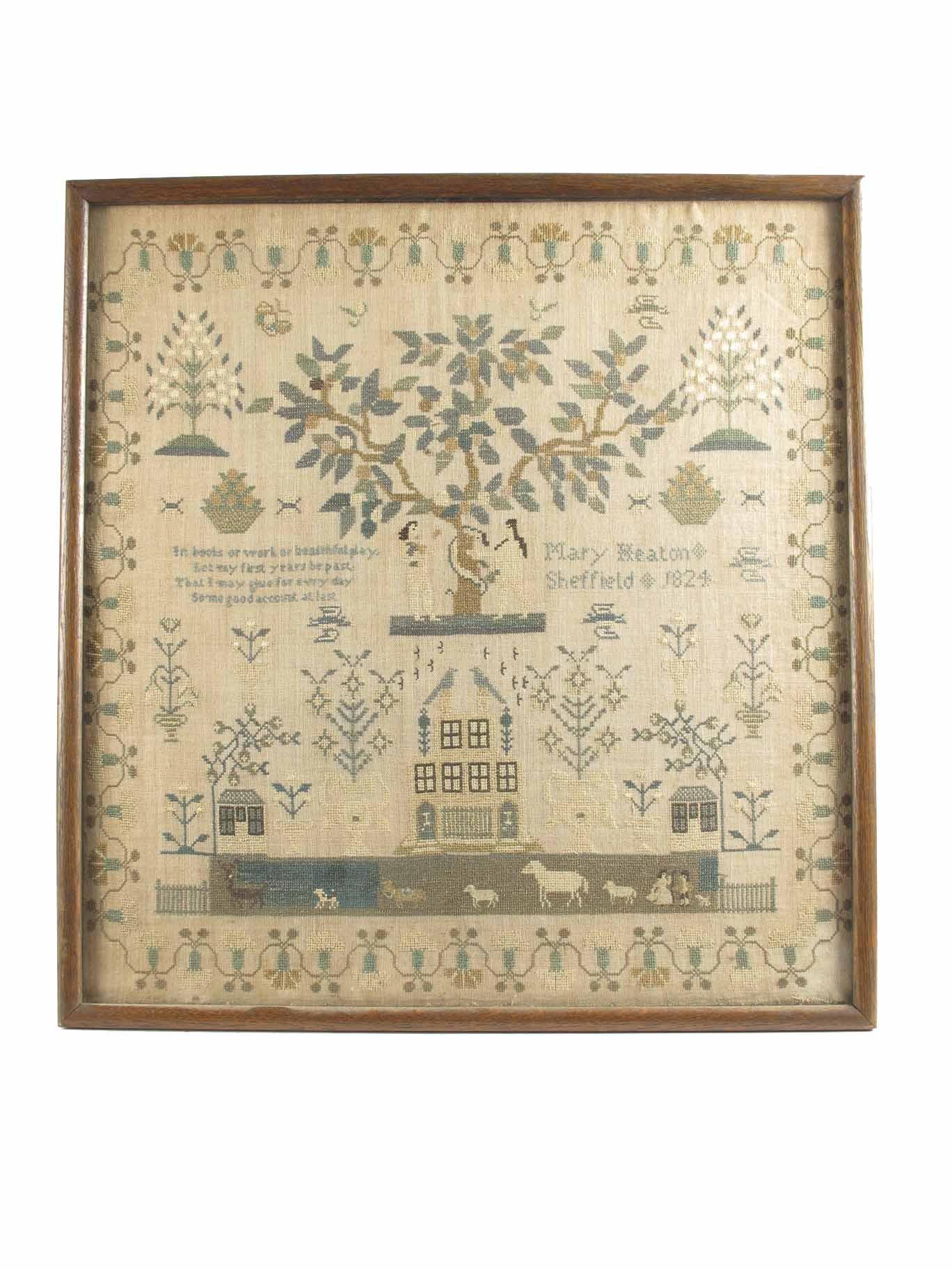 A George IV Adam and Eve sampler, Mary Heaton, Sheffield 1824, with plants, insects, birds, animals, verse, a three storey house flanked by cottages, a shepherd, shepherdess with animals with stylized scrolling border, 20.5 x 19.5in (52 x 49.5cm).