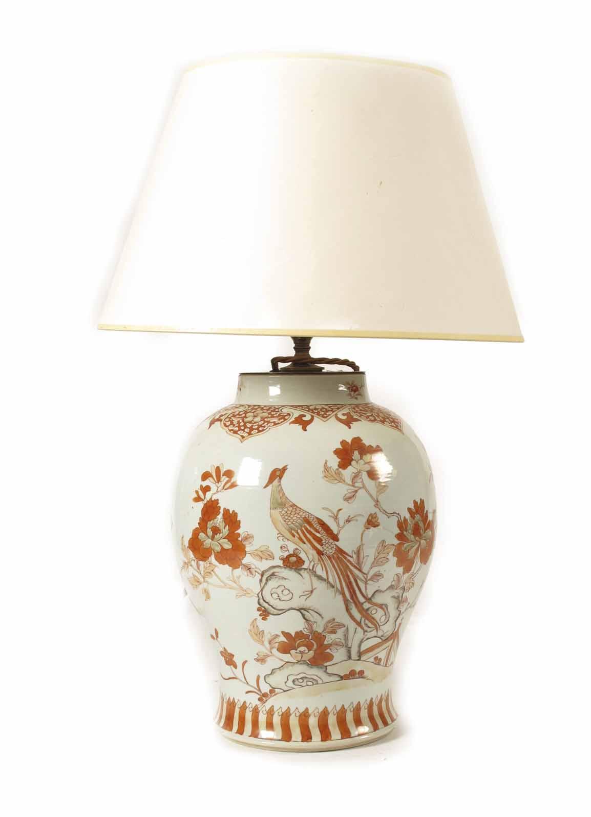A Chinese porcelain baluster table lamp, decorated an exotic bird on chrysanthemum rock work, repairs, the base drilled, with shade, 24.25in (62cm) h. Provenance: Netherhampton House, Salisbury, Wiltshire, Duke's June 16th 2003 Lot 65.