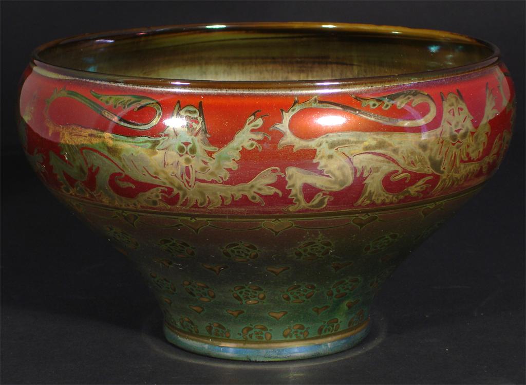 A Pilkington's Lancastrian vase designed by Walter Crane, painted by William S Mycock, decorated with a frieze of heraldic lions in copper and ruby lustre impressed mark, artists cyphers, datemark 1911 21cm. diam Provenance The Bill Coles collection