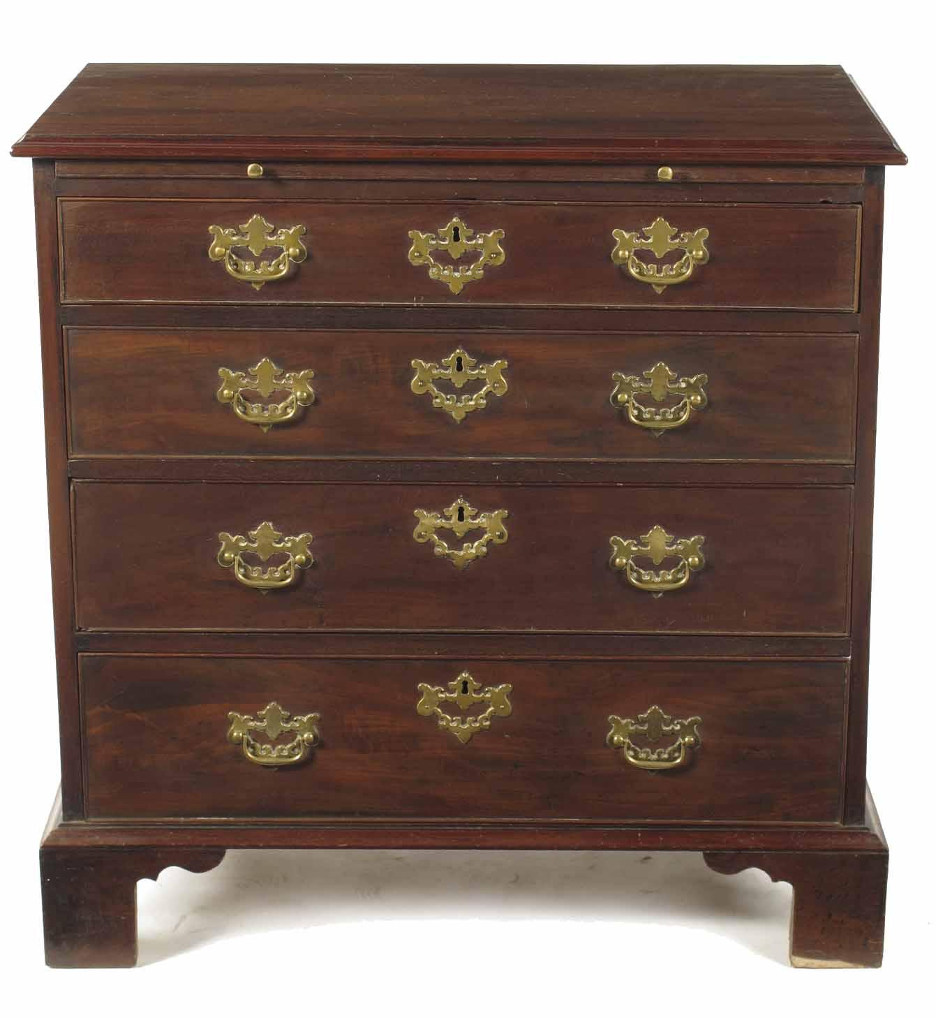 A George III mahogany chest, the moulded edge top above a brushing slide and four long graduated drawers, fitted open brass plate handles and escutcheons on bracket feet, 32.25in (82cm) h, 32.25in (82cm) w, 19in (48cm) d.