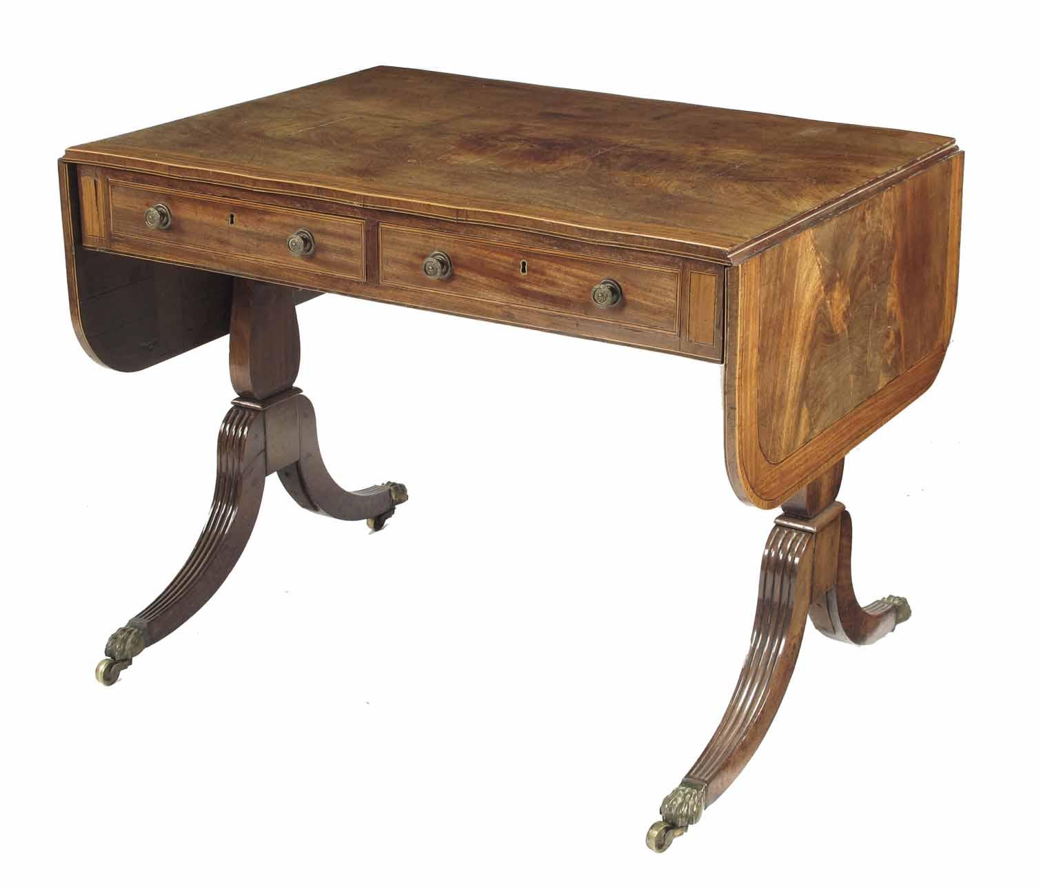 An early 19th century mahogany sofa table, with satinwood crossbanding and stringing, the twin flap top above a pair of frieze drawers and false reverse, on vase shape end supports and reeded splay legs with brass paw sabots and castors, 28.25in (71.5cm) h, 36.25in (92cm) w, closed, 27.5in (68cm) d.