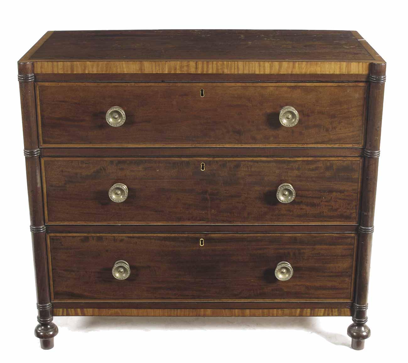 A Regency mahogany chest, satinwood banded, the rectangular top with protruding ears, with three long graduated drawers fitted gilt brass handles, flanked by split columns on turned bun feet, 34.5in (87.8cm) h, 39.75in (100.8cm) w, 19.25in (48.8cm) d.