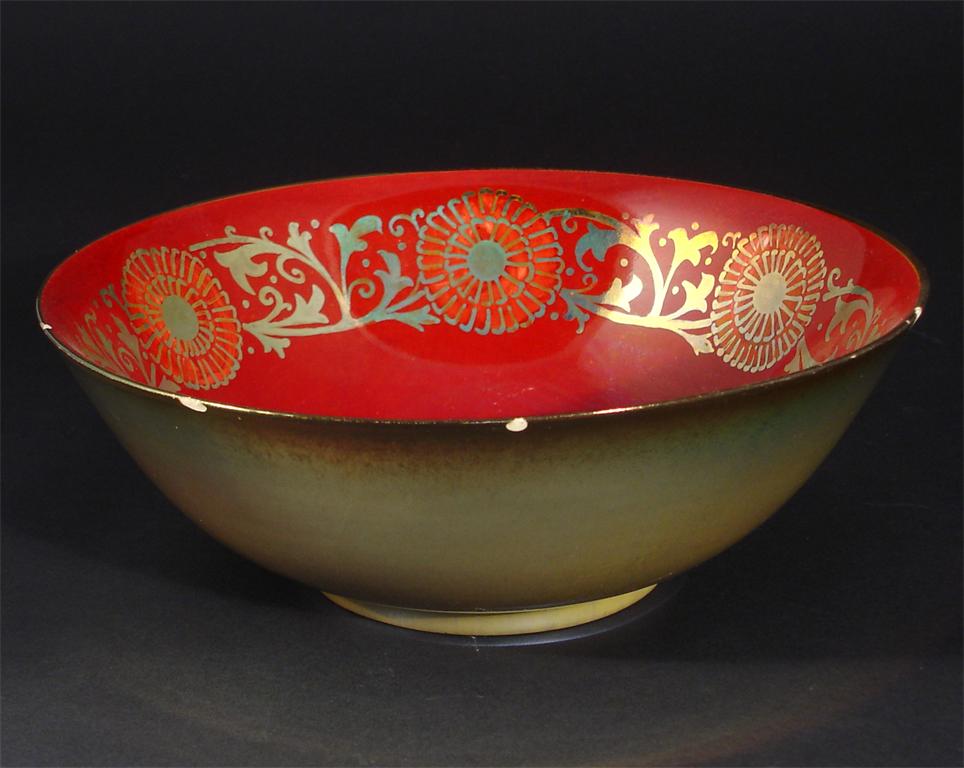 A Pilkington's Lancastrian bowl by William Mycock dated 1928,painted with stylised Chrysanthemums to the interior in red and gold, the exterior glazed gold impressed mark, painted artist cypher and datemark, chips to rim 23.5cm. diam.