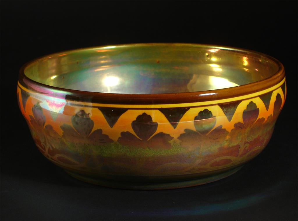 A Pilkington's Lancastrian bowl dated 1909, painted with a frieze of trefoil leaves in shades of gold and yellow lustre impressed mark, date mark, unknown painted datemark 18.5cm. diam.