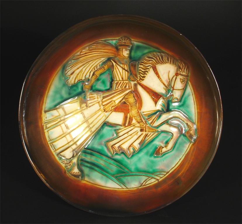 A Pilkington's Royal Lancastrian shallow bowl by Richard Joyce, incised with a knight on horseback, in colours impressed and incised marks, painted artist cypher, restored 27cm. diam.
