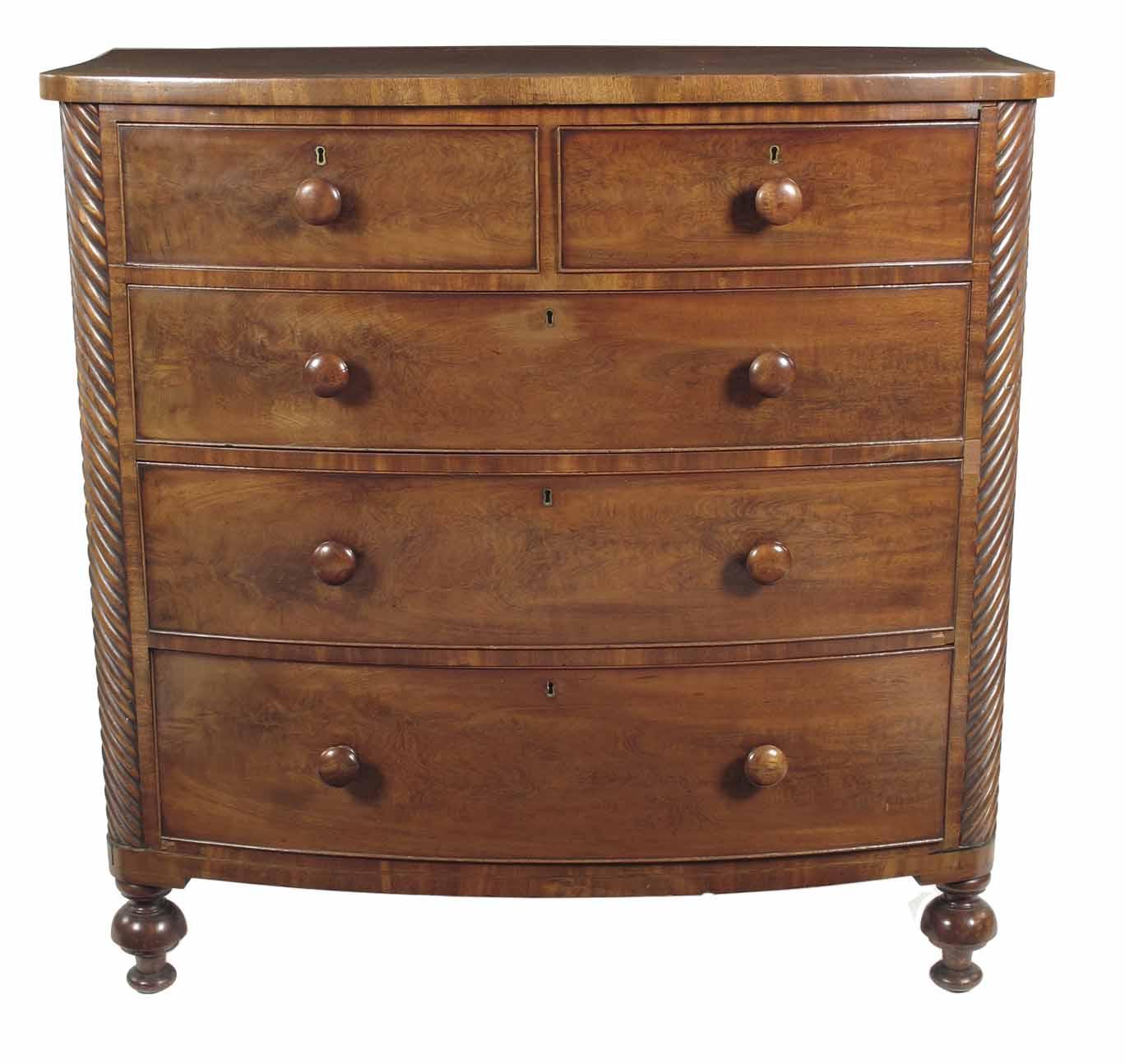 A Victorian mahogany bowfront chest, the drawers fitted wood knob handles flanked by spiral ribbed quarter pilasters on turned mushroom feet, 45.5in (115.5cm) h, 46in (117cm) w, 25.5in (57cm) d.