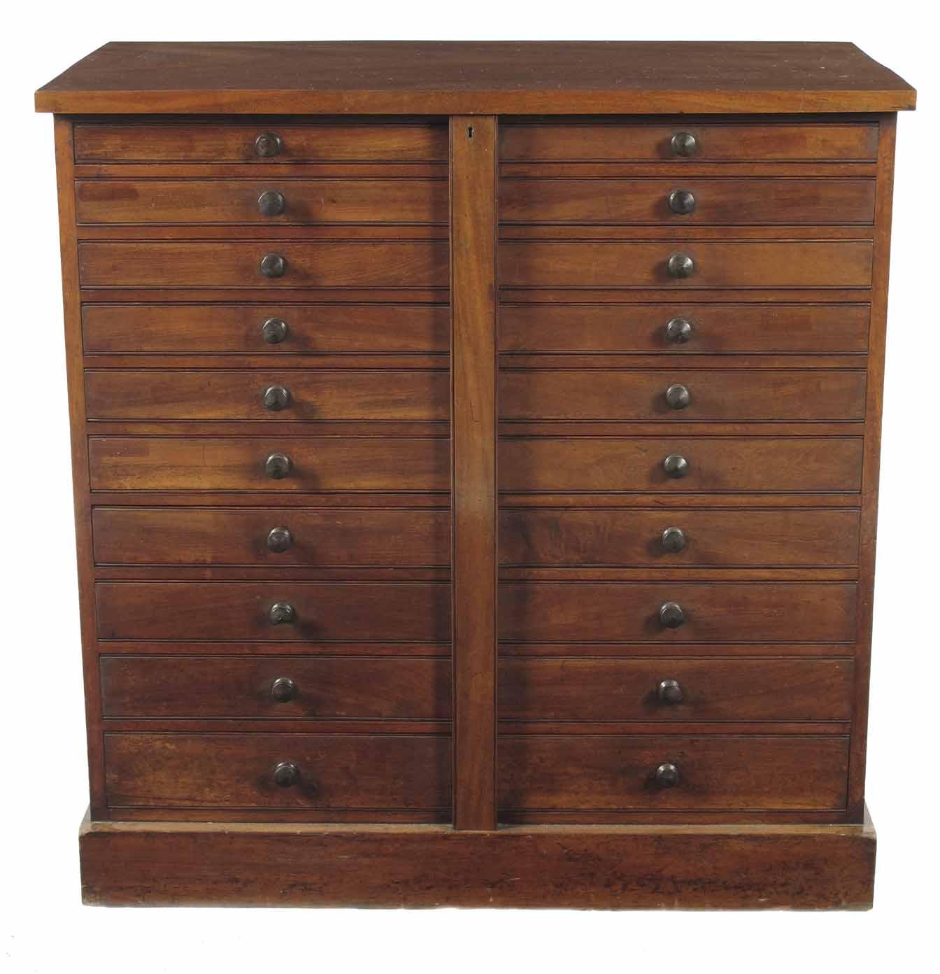 A late Victorian mahogany collector's chest, with twenty short graduated drawers fitted a central ebonised wood handle, having a central locking bar, 37in (94cm) h, 36.25in (92cm) w, 19.5in (49.5cm) d.