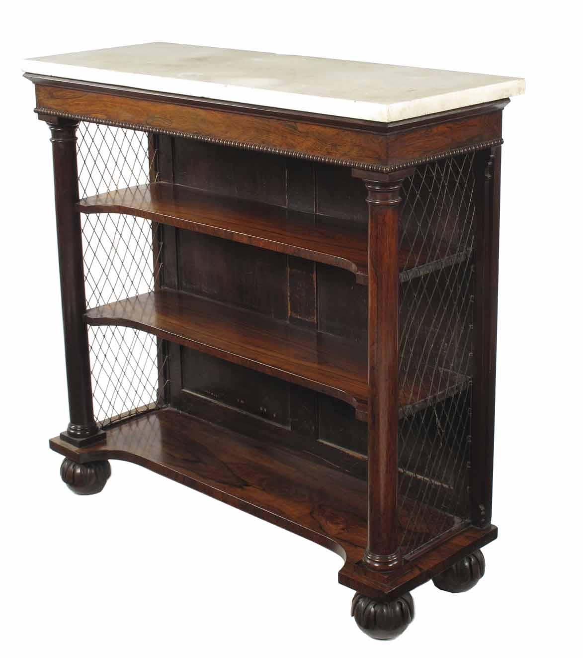 A George IV rosewood bookcase, the white marble rectangular top above a reel moulded frieze and three concave front shelves with turned column supports and brass grille sides on petal carved and turned bun feet, 35.25in (89.5cm) h, 36.25in (92cm) w, 13.5in (34.5cm) d.