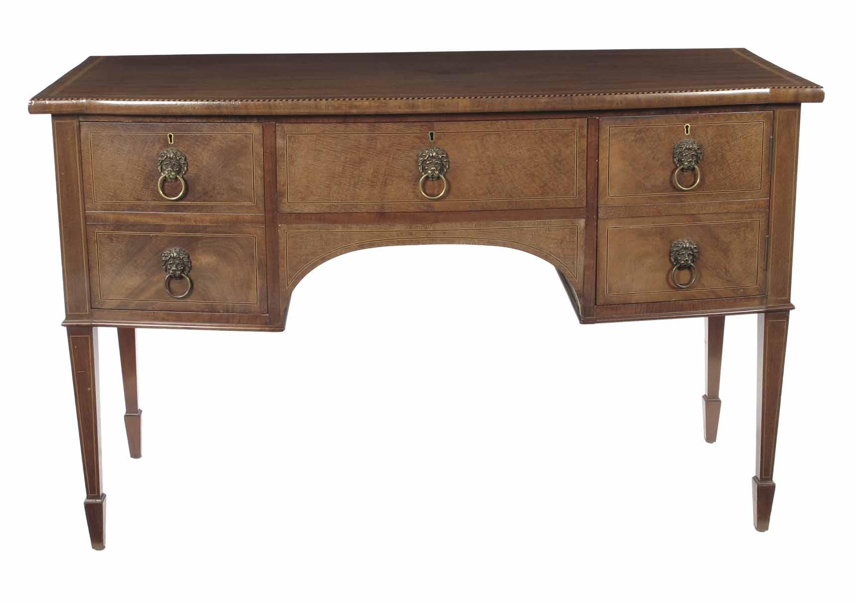An Edwardian mahogany barrel front sideboard, with satinwood banding and barber's pole stringing to the top, the front with boxwood and ebonised stringing, with a central frieze drawer flanked by a deep drawer with a lift-out cutlery tray and a cupboard door enclosing a shelf, fitted brass lion's mask ring handles, 34.5in (87.5cm) h, 54.25in (136cm) w, 24in (61cm) d.