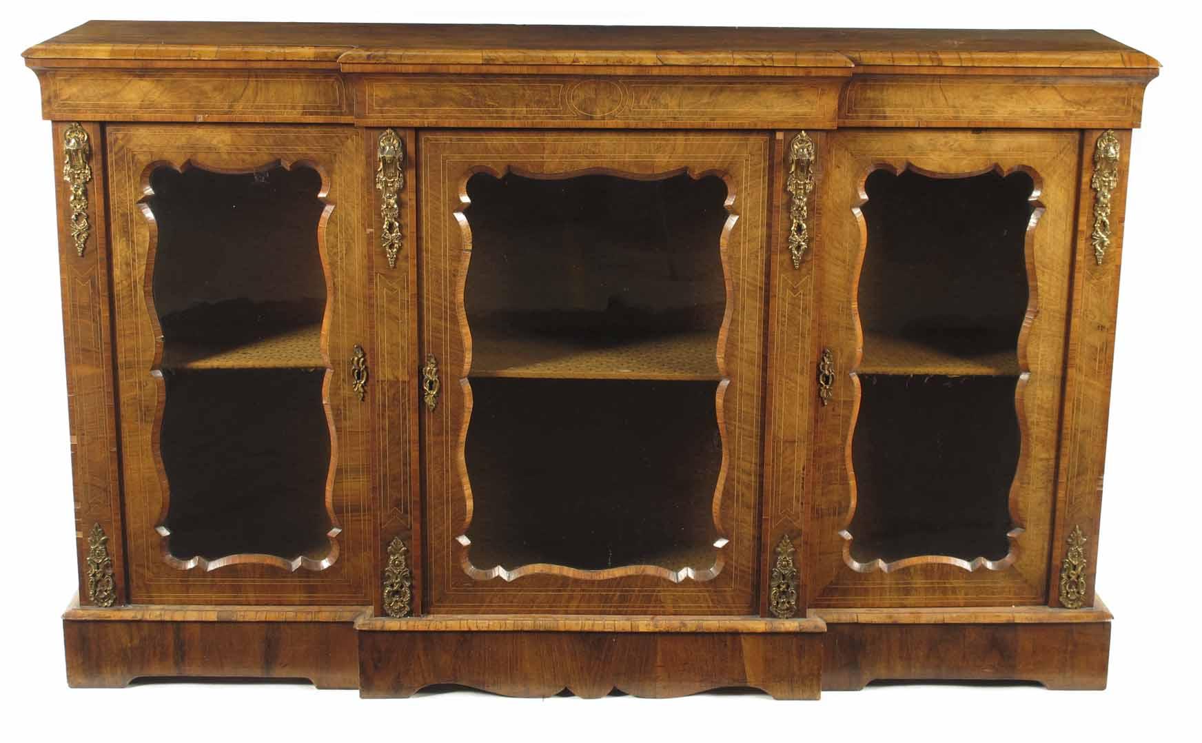A Victorian walnut breakfront side cabinet, with stringing and gilt brass mounts, with three glazed doors having shaped rectangular frames, 42in (107cm) h, 69in (175.5cm) w, 15.5in (40cm) d.
