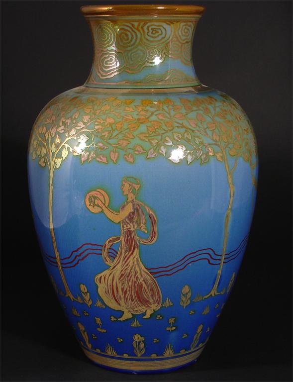 A Pilkington's Lancastrian vase by Gordon Forsyth, painted with a frieze of classical maidens in ruby and copper lustre on a blue ground impressed marks, artist cypher and datemark 1908, loss to top rim and base rim 36cm. high