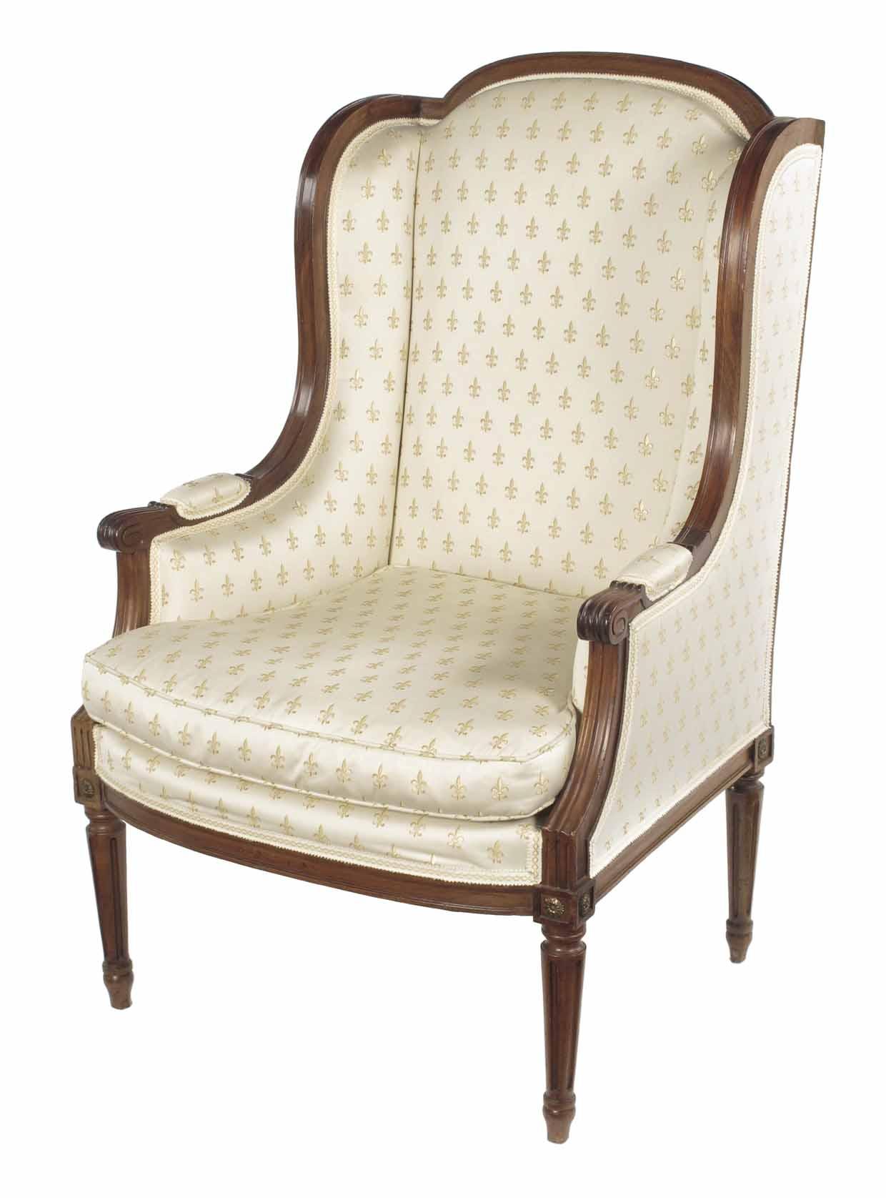 A French mahogany fauteuil, with later upholstered fleur-de-lys fabric, the moulded frame with scroll arms and fluted tapering legs, late 19th century.