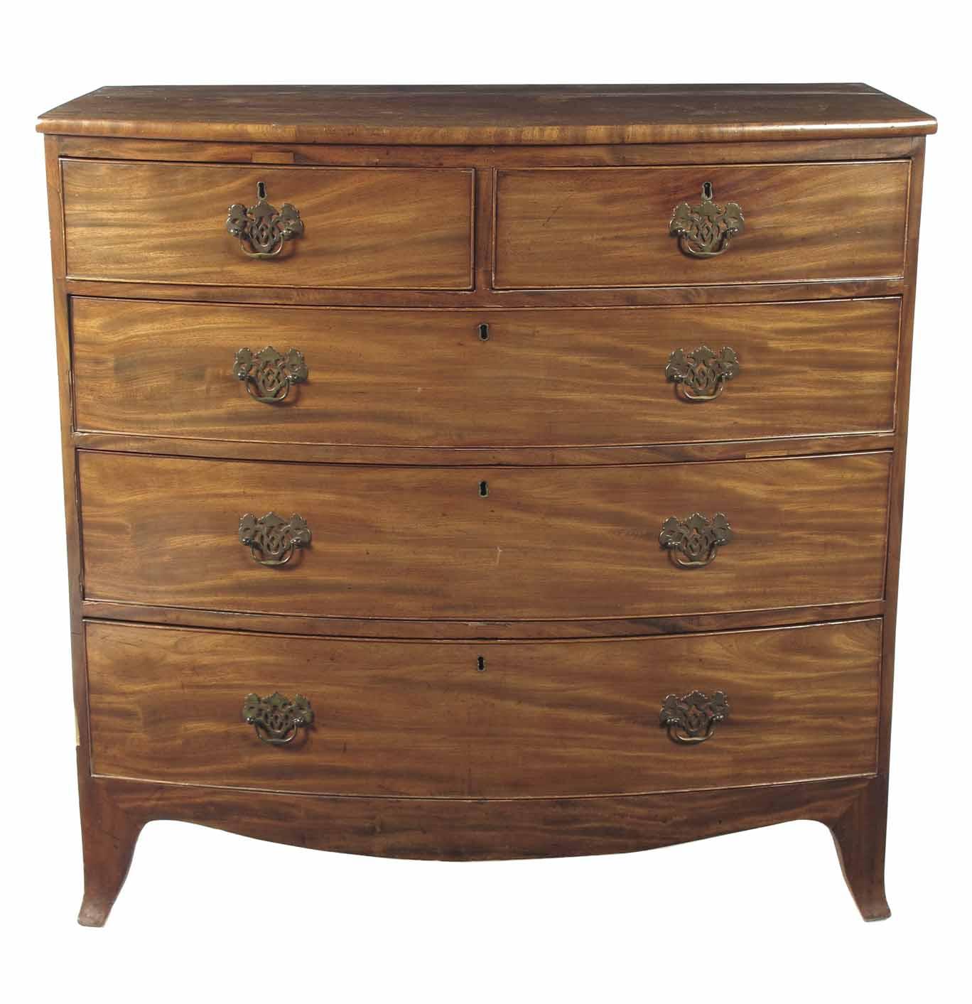 An early 19th century mahogany chest, of two short and three long graduated drawers fitted later pierced brass plate handles on splay feet, 41in (104cm) h, 41.75in (106cm) w, 21in (53cm) d.
