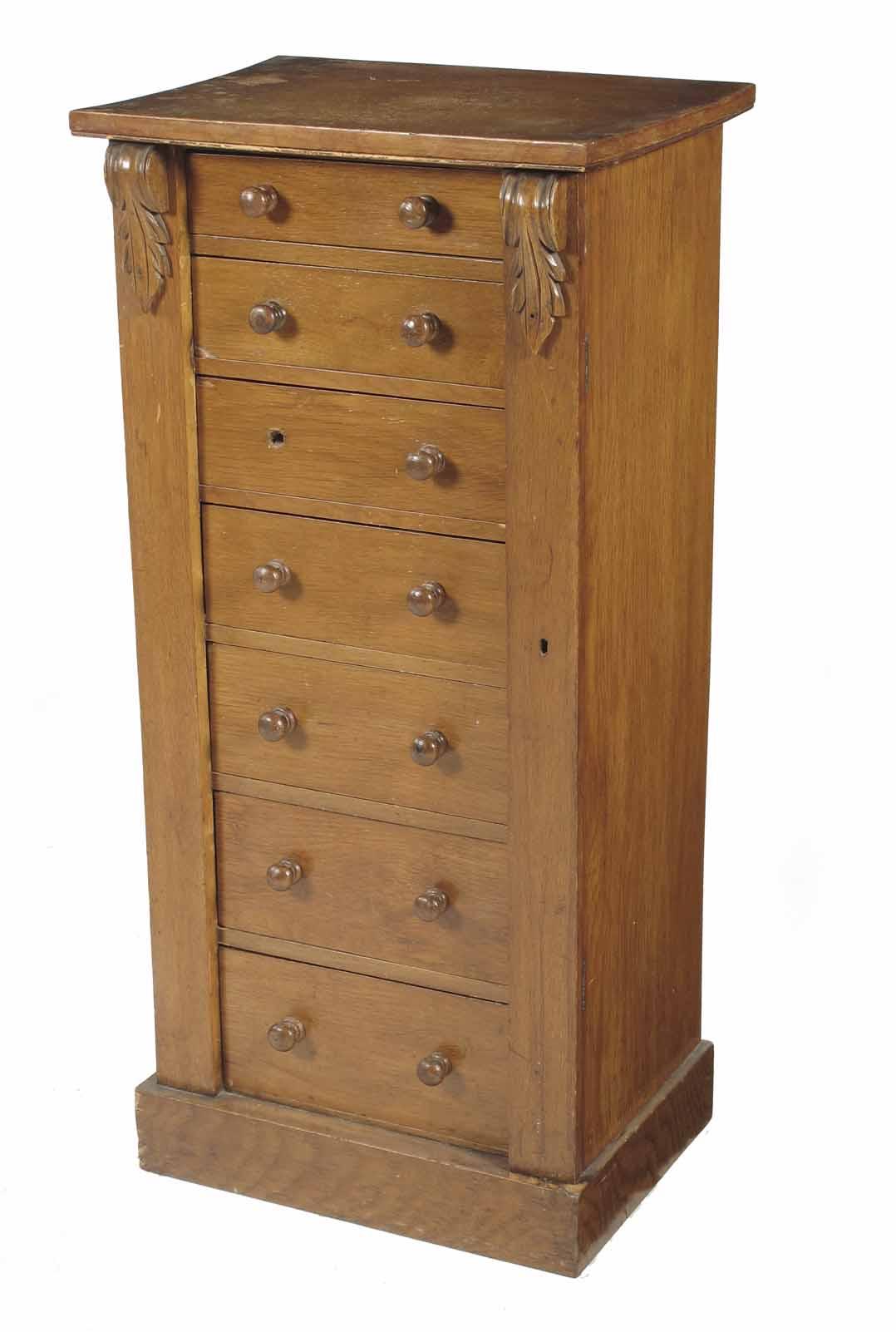 A Victorian oak Wellington chest, of seven graduated drawers, 39.75in (101cm) h, 19in (48.2cm) w, 13.5in (34.1cm) d. One handle missing.