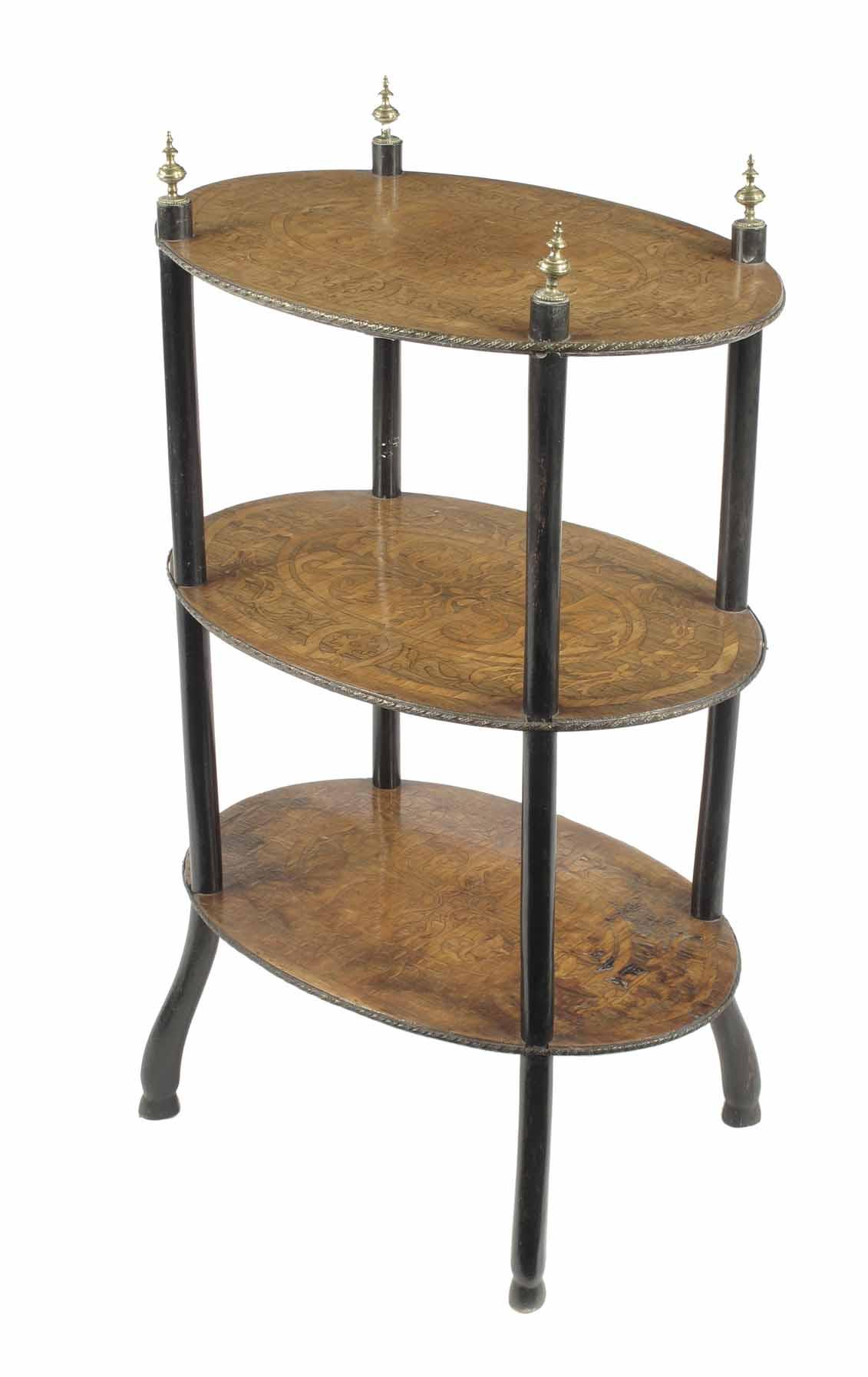 A late 19th century French three tier etagere, with rosewood and satinwood marquetry oval tiers, ebonised supports and gilt brass mounts, 32.5in (82.5cm) h, 19.75in (50cm) w, 13.5in (34cm) d.