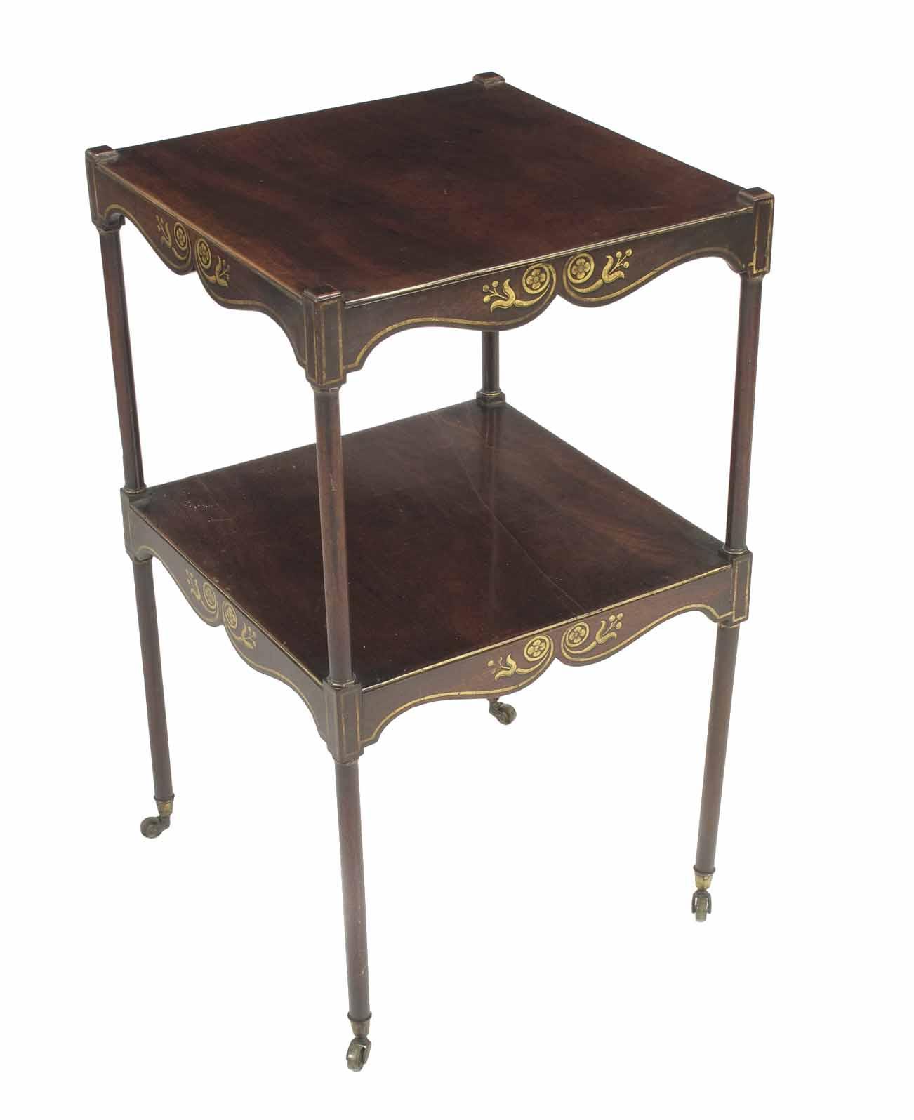 An early 19th century mahogany two tier etagere, with arc d'arbelet friezes with painted gilt highlights with turned supports on brass castors, 29in (73.5cm) h, 16.5in (42cm) w and d.