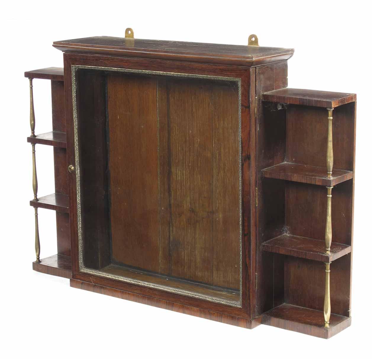 A late 19th century rosewood and brass mounted wall cabinet, the central glazed door previously enclosing two shelves, flanked by open shelves with slender baluster supports, 26in (66cm) h, 37.5in (95cm) w, 7in (18cm) d.