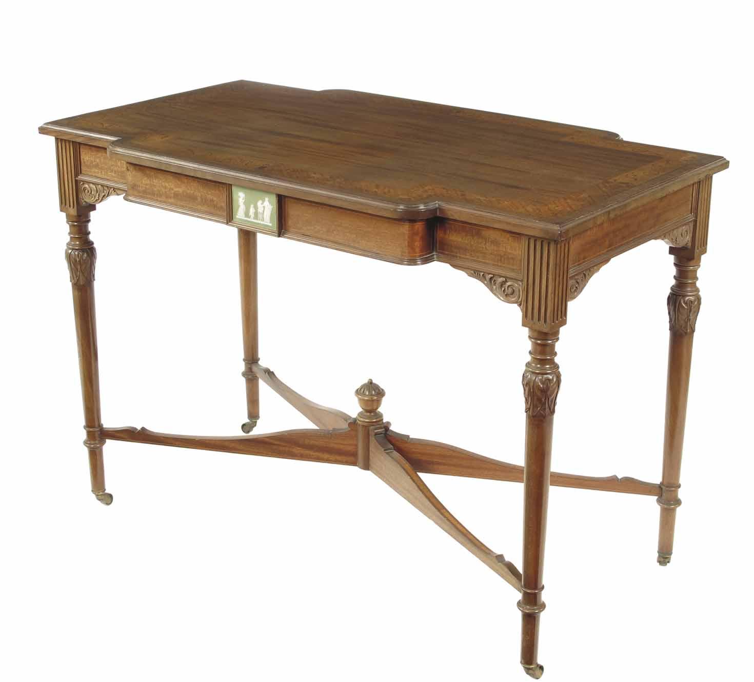 A late Victorian mahogany and marquetry centre table in Adam Revival style, the satinwood banded top inlaid scrolling foliage to a frieze inset a Wedgwood style Jasperware plaque to either side depicting classical figures, with acanthus carved tapering legs united by an 'X' stretcher on brass castors, 29.75in (75.5cm) h, 42in (106.7cm) w, 24.75in (62.7cm) d. Faded.