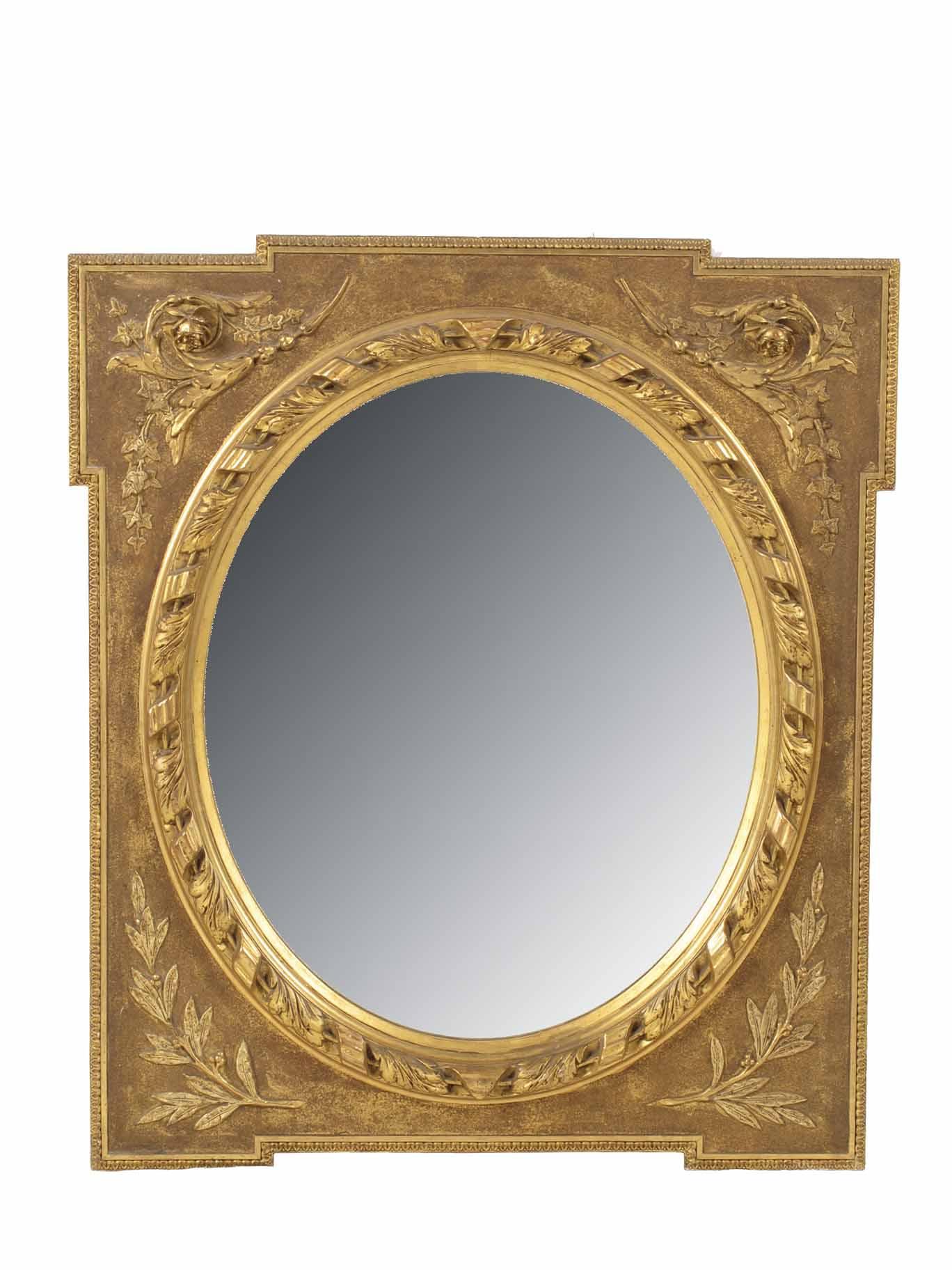 A giltwood and gesso oval wall mirror, with a leaf and ribbon decorated border, the shaped rectangular frame with foliage to a sand textured ground, 32.5 x 28in (82.5 x 71cm).