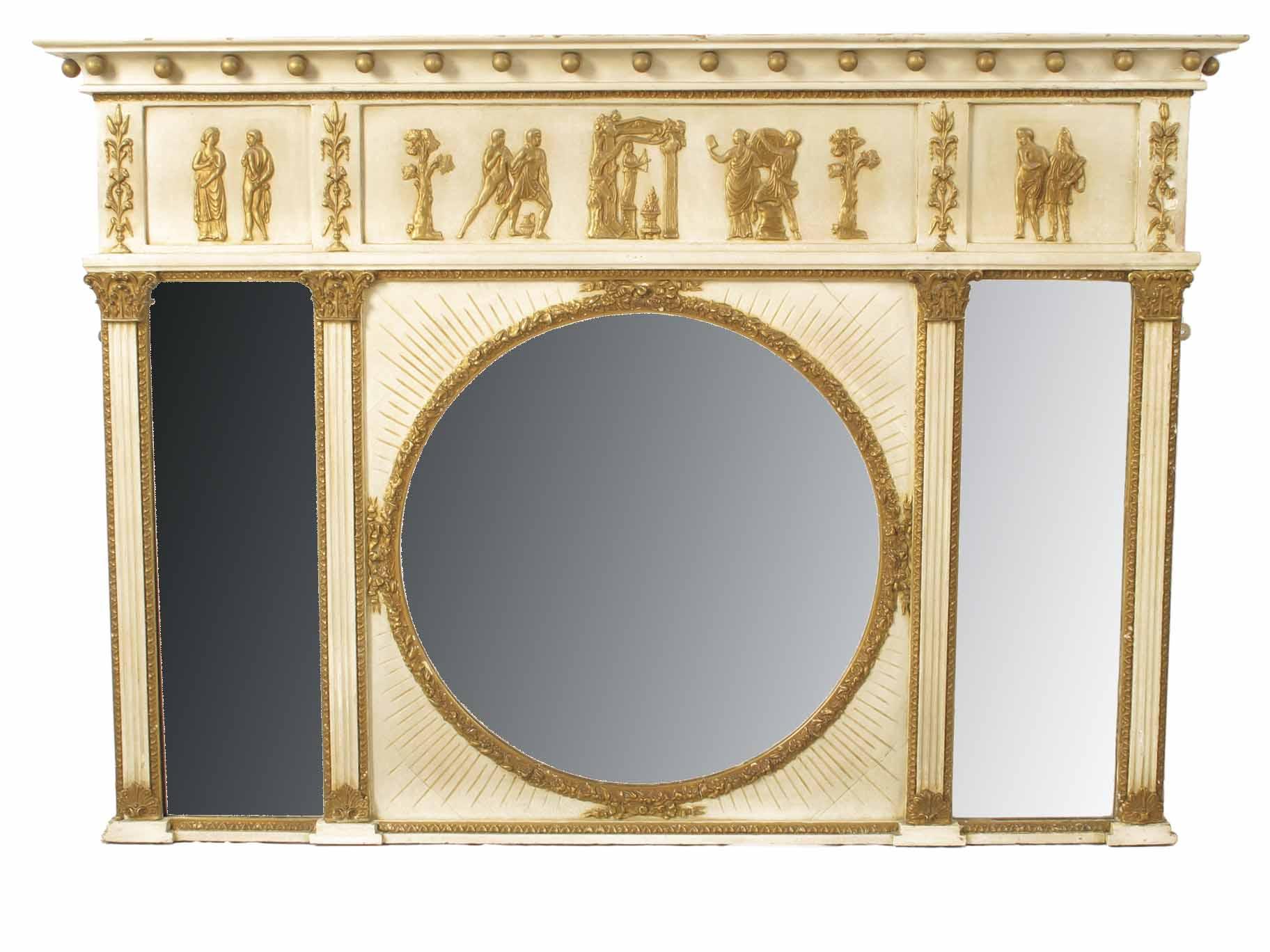 An Edwardian cream and gilt decorated overmantel mirror, with a central circular bevelled plate, flanked by a pair of rectangular bevelled plates, above a classical decorated frieze, 37.75 x 54.5in (96 x 138.5cm).