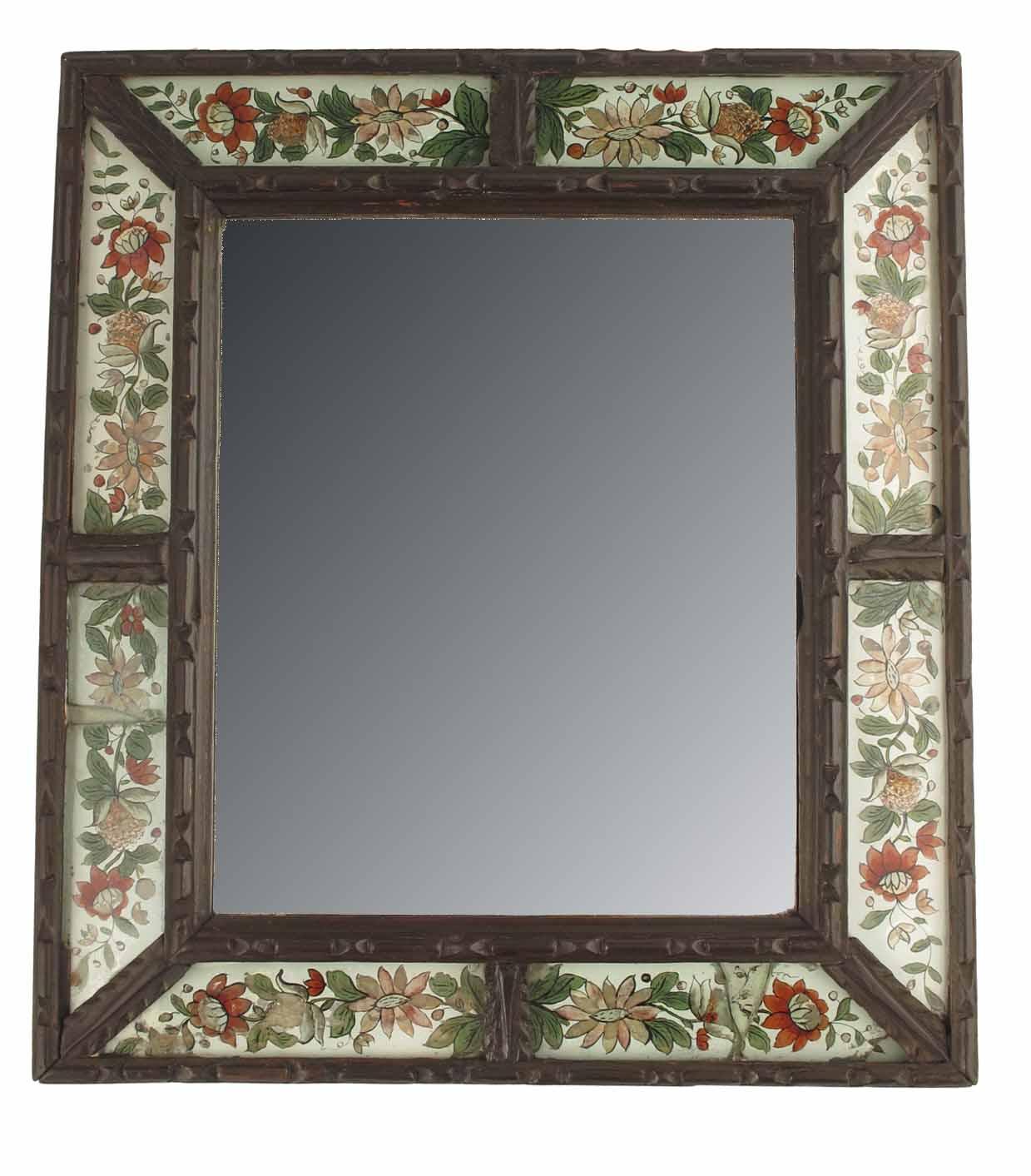 A 19th century continental wall mirror, with a rectangular bevelled plate to a carved leaf and baton frame having floral painted reverse glass outer panels, 15.75 x 14in (40 x 35.5cm)