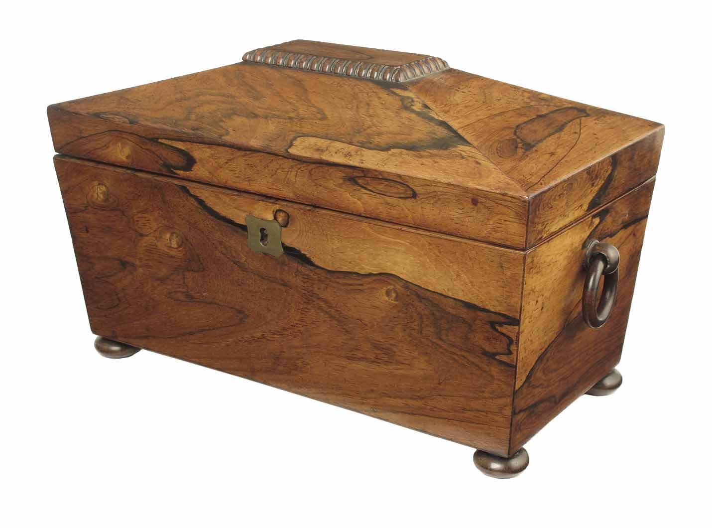 A William IV rosewood sarcophagus shape tea chest, the hinged lid with nulled mouldings to an interior fitted with twin lidded pull-out canisters and an associated glass sugar bowl, with ring handles, 8in (20cm) h, 12.75in (32.3cm) w, 6.75in (16.7cm) d.