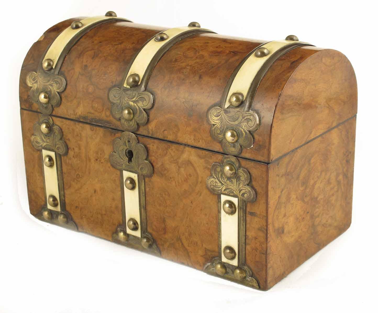 A Victorian burr walnut domed tea caddy, with engraved brass and ivory mounts, the interior with a bowl recess and a lidded compartment, 6.5in (16.5cm) h, 9.5in (24cm) w, 5.25in (13.5cm) d.