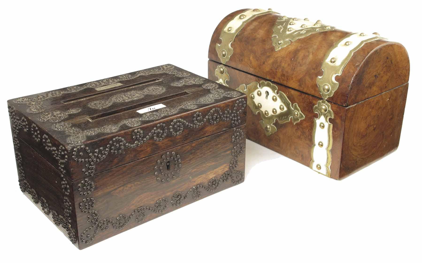 A 19th century rosewood and steel studded letter box, the hinged lid with two pierced apertures, each titled one on mother of pearl and inscribed 'Answered' the other replaced with bone 'In', to a divided interior, 4.5in (11cm) h, 8.5in (21.7cm) w, together with a Victorian walnut, brass and ivory mounted domed box, interior lacking. (2)