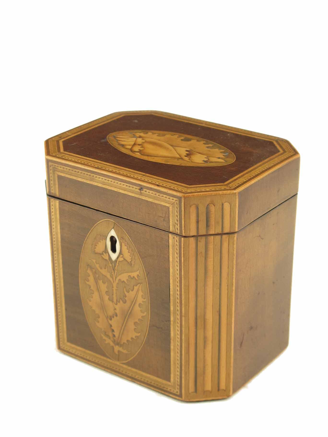 A late George III harewood and marquetry tea caddy, of canted cube form with stringing and faux fluting, inlaid a conch and leafy flower, the interior with remains of foil, 4.75in (12cm) h & w, 3.75in (9.5cm) d.