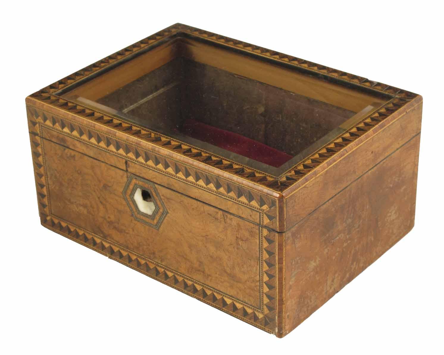 A Victorian walnut and parquetry glass top box