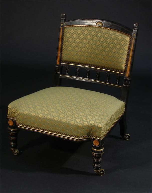 A James Lamb ebonised wood nursing chair, with embroidered seat and back unmarked 73cm. high