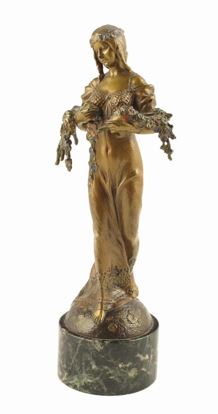 An Austrian cold painted bronze figure of a young woman, wearing a flowing dress and floral wreath, whilst holding two bouquets of flowers, indistinctly signed, on a green marble plinth, early 20th century, 9.5in (24cm) h.