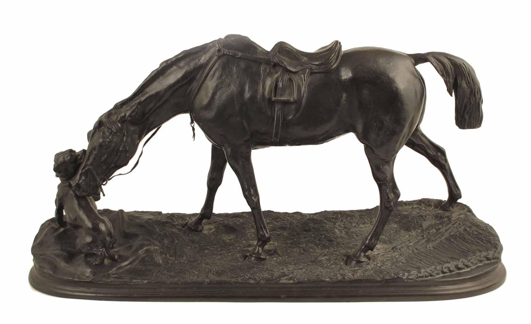 After Pierre Jules Mene (1810 - 1879). Mare and Dog. Cast iron with bronze finish, probably by Coalbrookdale, 9.5in (24cm) h, 19in (48cm) w.