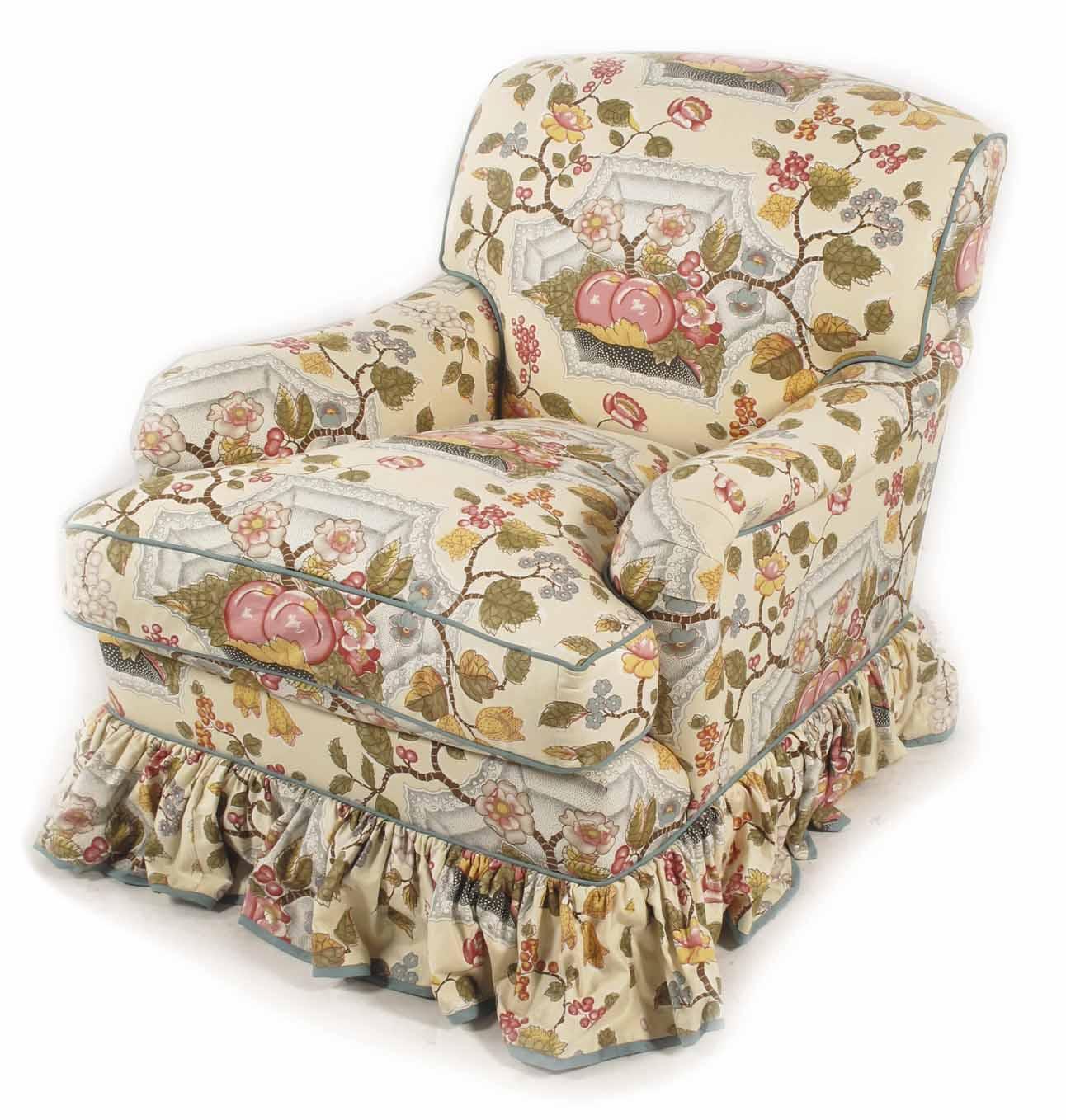 A modern easy armchair by George Smith, upholstered in floral material on turned stained wood legs, previously with castors.