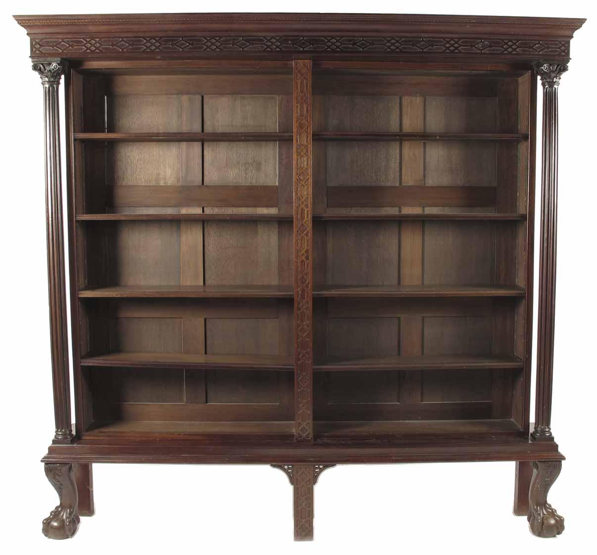 A mahogany open bookcase by J.H. & G. Elliott, Sherborne, Dorset, with carved blind fret decoration, adjustable shelves with central division and flanked by acanthus capped fluted columns, on carved acanthus and claw and ball feet, 78.25in (199cm) h, 83in (211cm) w, 13.75in (35cm) d.