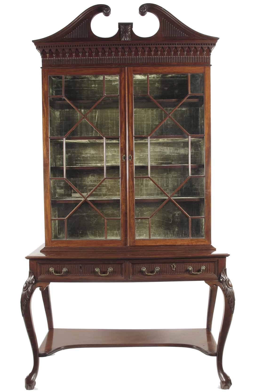 A mahogany cabinet on stand, with carved and fluted decoration, having a detachable swan neck pediment above a plush lined shelved interior enclosed by a pair of astragal glazed doors, the base with a pair of frieze drawers on leaf capped cabriole legs with an undertier, 1st quarter 20th century, 91in (231cm) h, 49in (124cm) w, 22in (56cm) d.