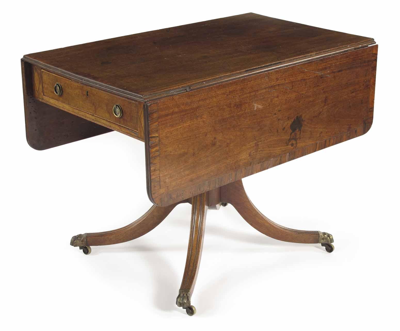 A George IV mahogany supper table, the rosewood crossbanded and reeded edge twin flap top to a single frieze drawer with a dummy to the reverse both with later handles, on a spiral twist column to moulded downswept supports terminating in brass lion's paw sabots and castors, 28in (71cm) h, 28.75 x 46.25in (98.6 x 117.8cm). Veneer loss to banding.