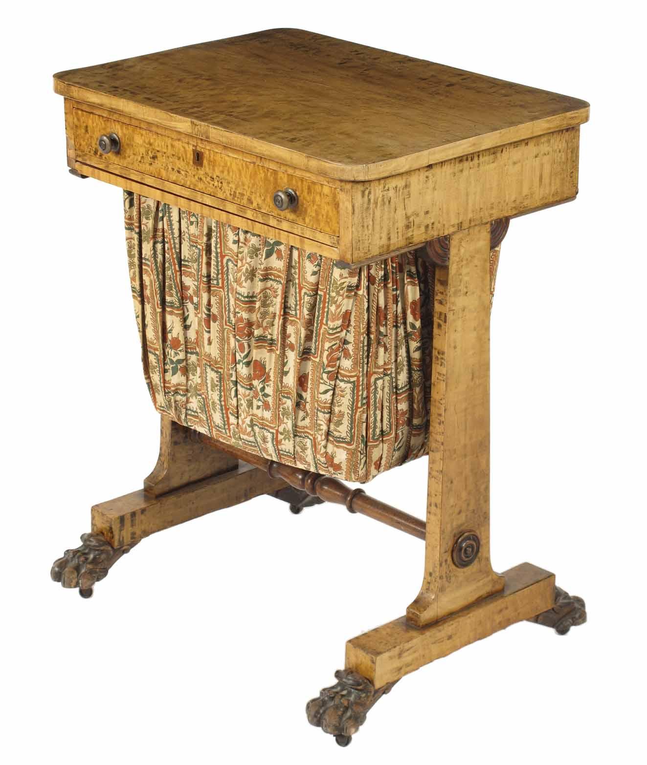 An early Victorian bird's eye maple work table, with a divided frieze drawer and pull-out bag, with tapering trestle end supports and reeded quarter brackets united by a turned stretcher, the platforms with ebonised carved paw feet on iron castors, 27.5in (70cm) h, 21.5in (54.5cm) w, 17.5in (44.5cm) d.