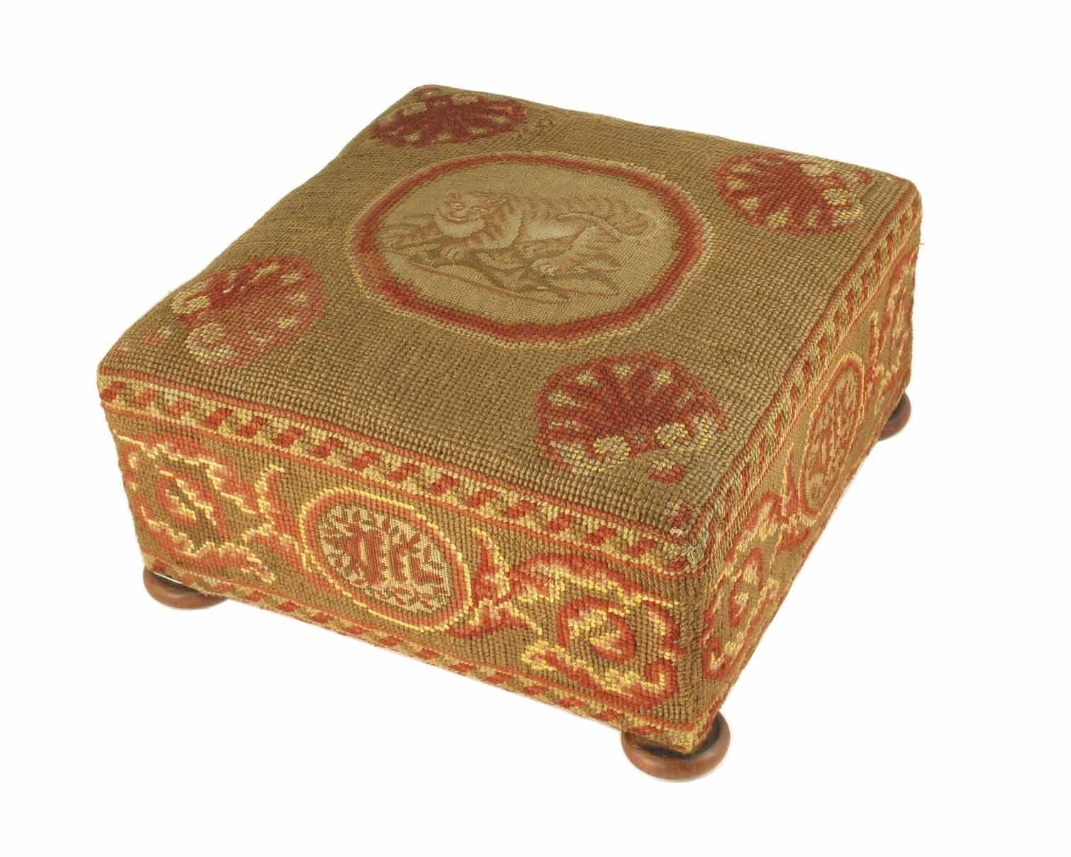 An early Victorian upholstered footstool, the centre with a circular panel of a tiger with scallops to the corners, the foliage frieze centred conch shells on later turned feet, 7.5in (19cm) h, 14.5in (37cm) w.