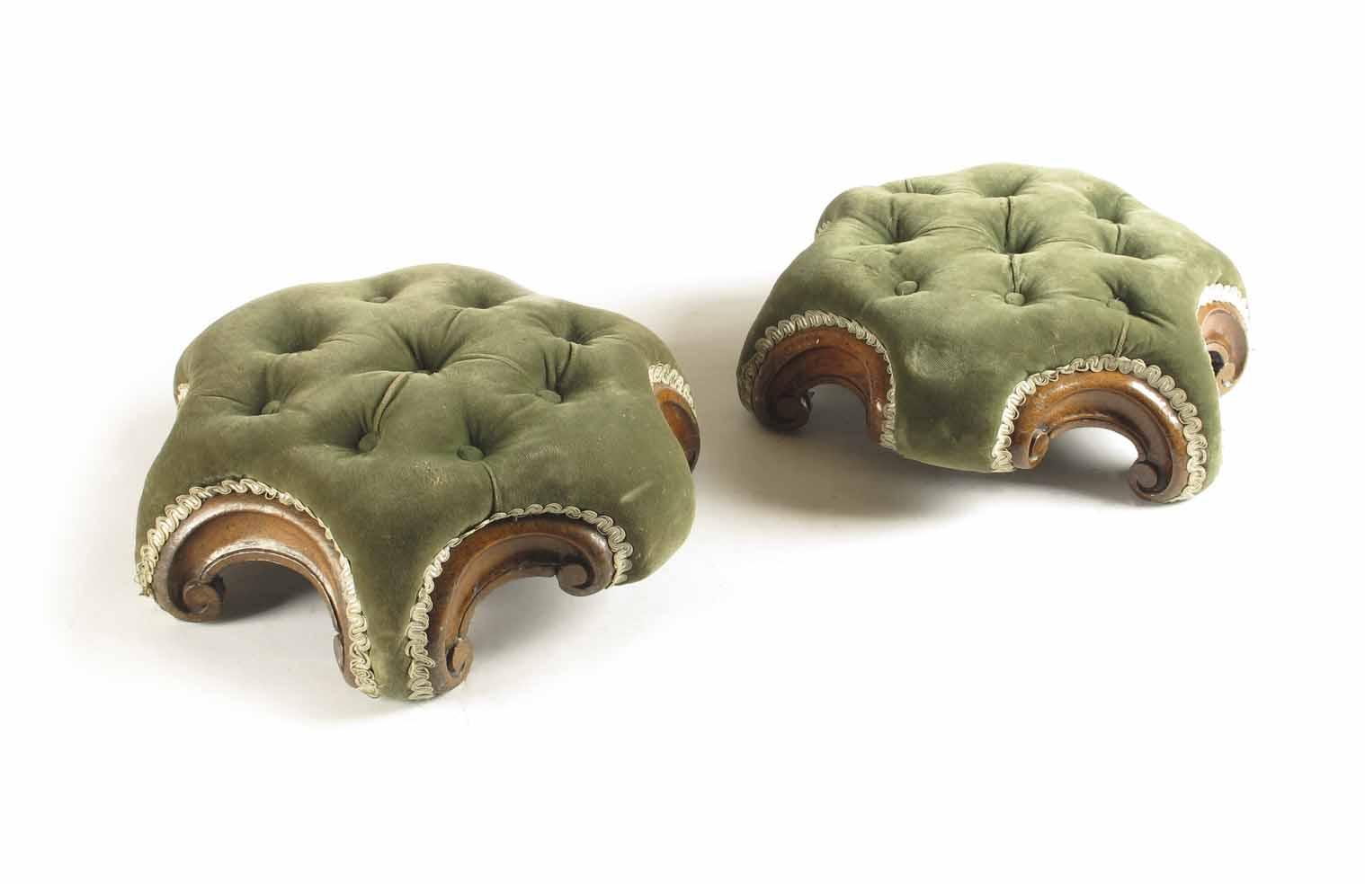A pair of Victorian footstools, button upholstered with mahogany scroll frames and feet, 5in (13cm) h, 15in (38cm) w. (2)