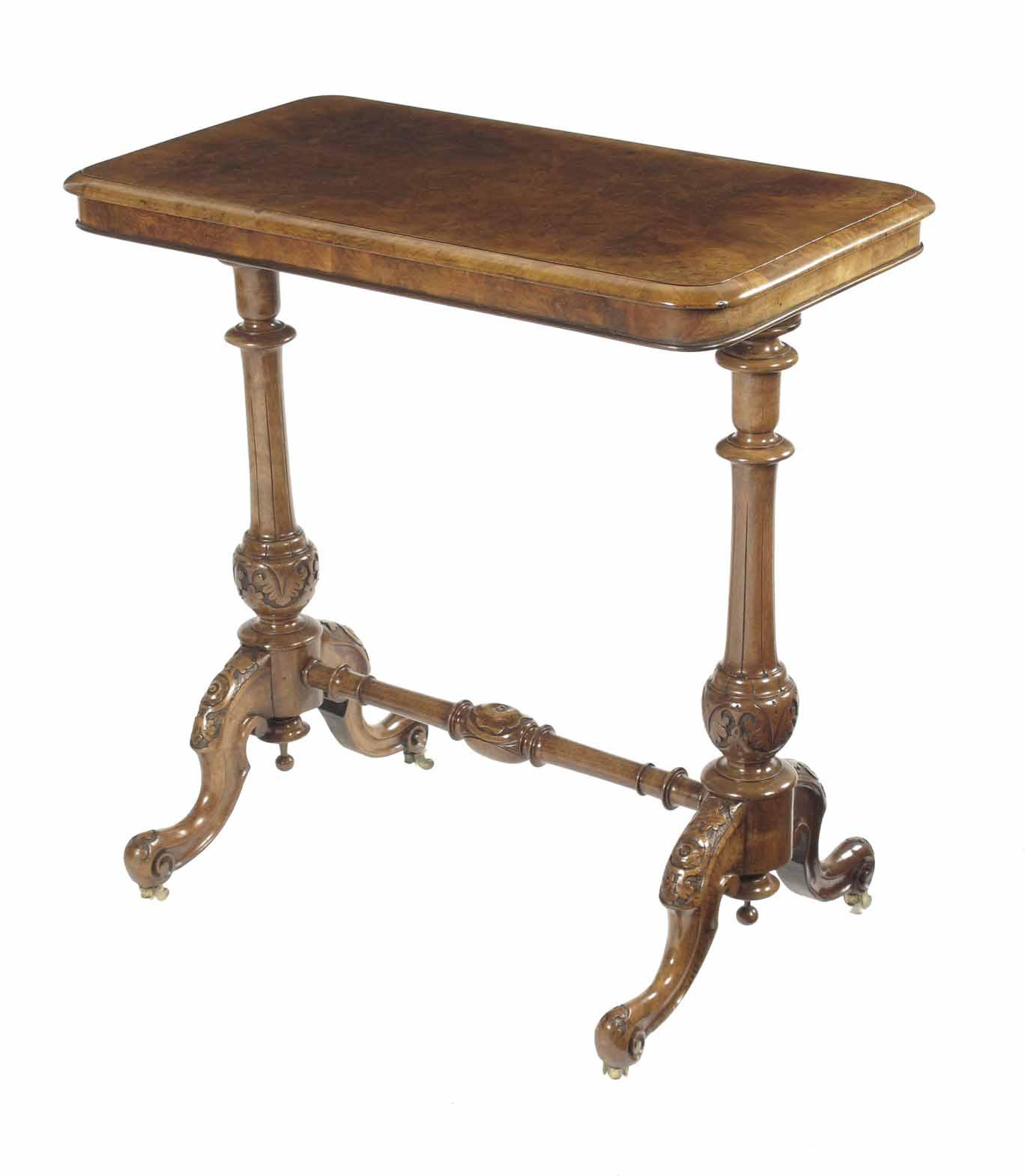 A Victorian walnut side table, having a quarter veneered burr walnut rectangular top on turned and carved supports and cabriole legs united by a stretcher on ceramic castors, 28in (71cm) h, 27.25in (69cm) w, 15in (38cm) d.