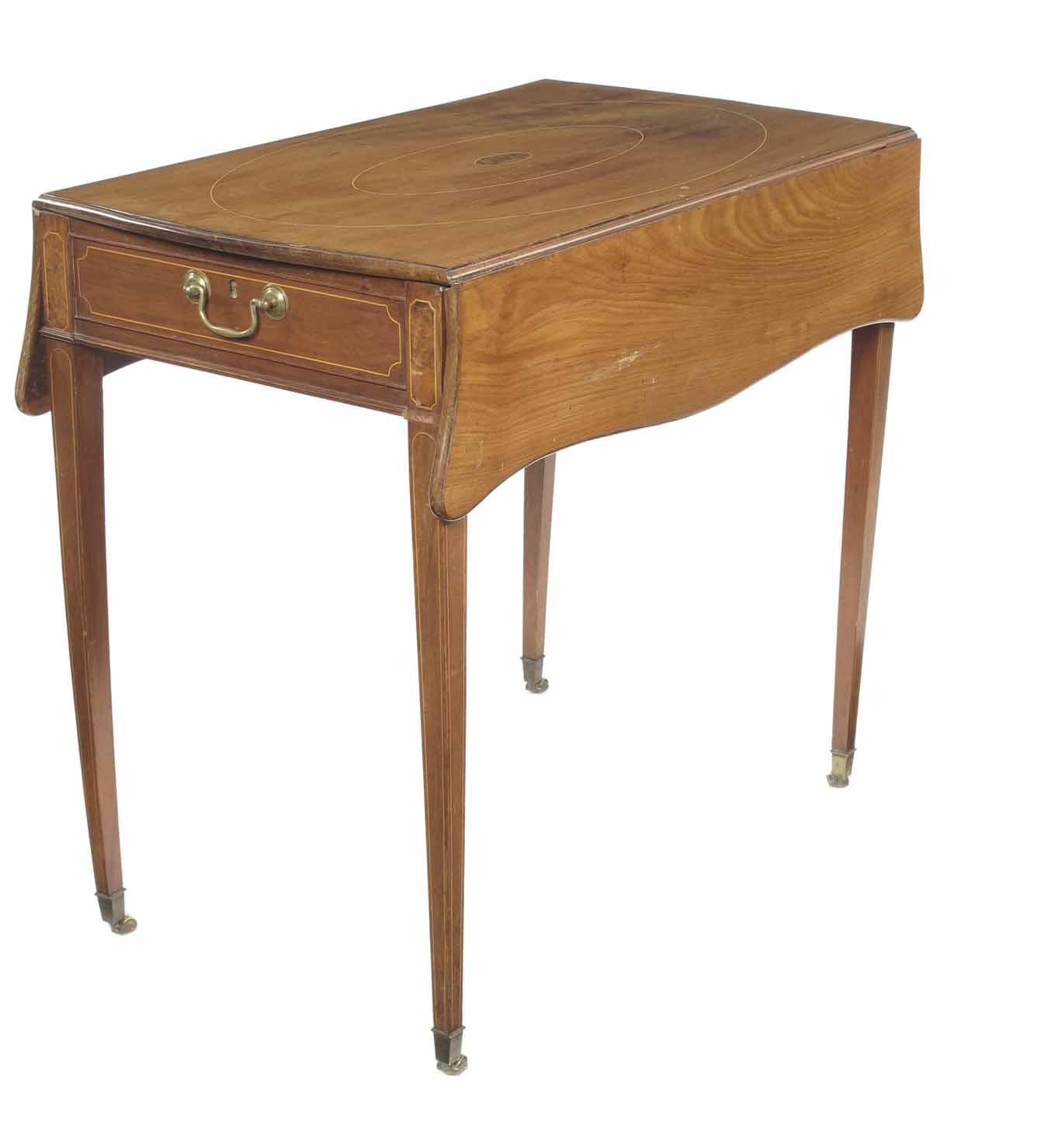 A 19th century mahogany Pembroke table, inlaid stringing and later burr yew panels, the moulded edge serpentine top above a frieze drawer, on square tapering legs and brass caps and roller castors, 27.5in (69.9cm) h, 30.75in (78cm) w, 18in (45.7cm) d.